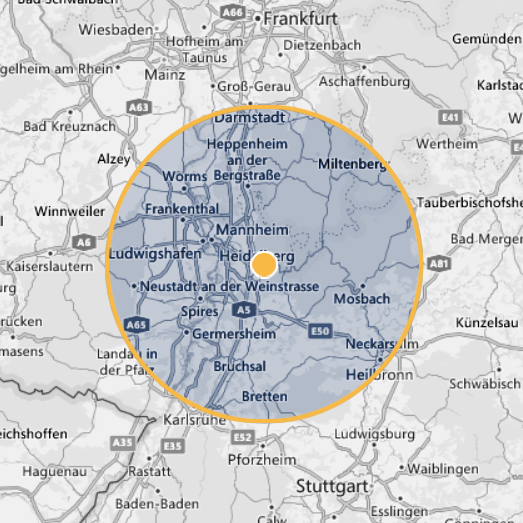 Unser umfangreiches Leistungsspektrum stellen wir in einem Einzugsgebiet von 50 km um Heidelberg herum zur Verfügung. Die Anfahrt ist natürlich immer kostenfrei. In diesem Umkreis übernehmen wir auch gerne Seniorenumzüge.